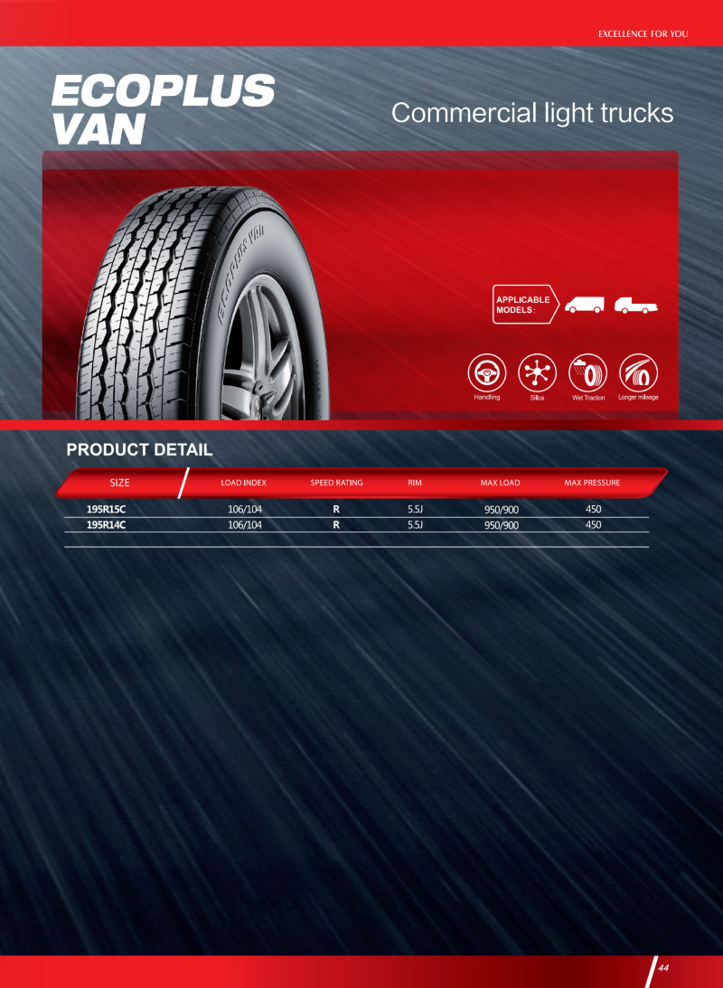 ECOPLUS VANBusiness light truck tires with longitudinal twists and wide grooves provide excellent handling. Enhanced sidewall structure for higher safety.