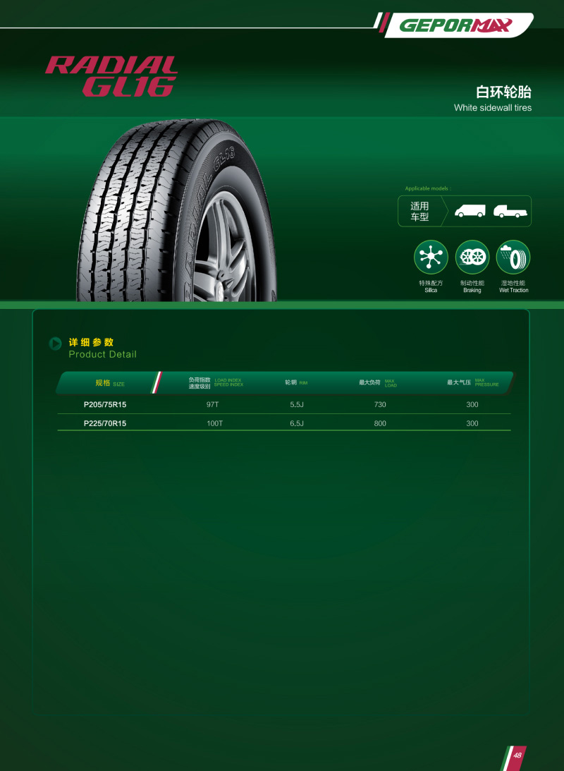 RADIAL GL16The white ring decoration on the tire side attracts more attention when driving, with a unique pattern design that has good drainage performance and braking force