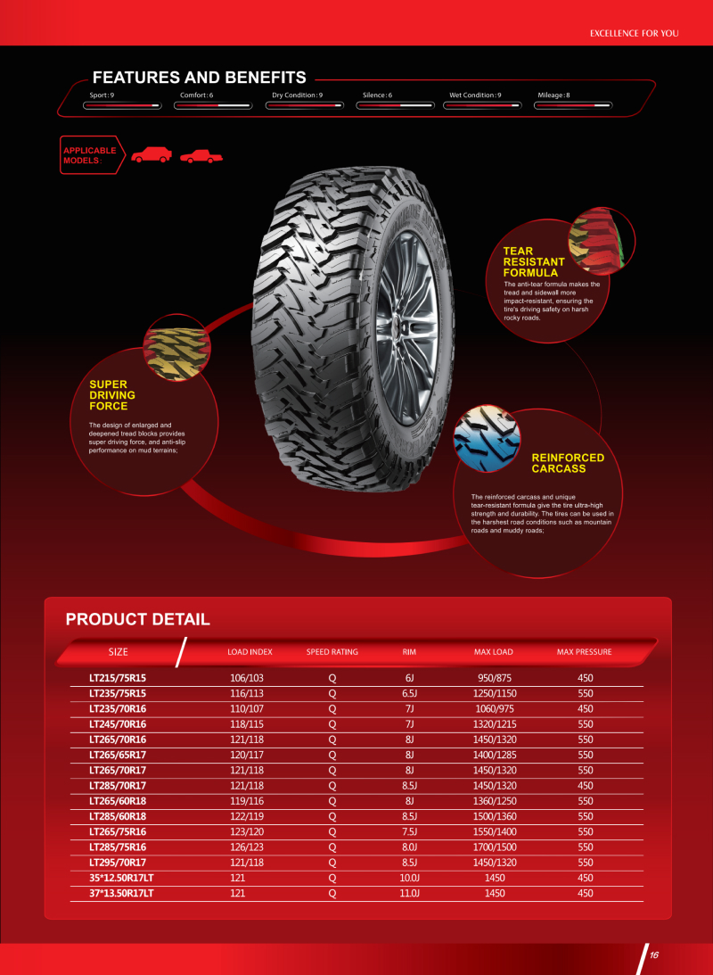 火焰型大塊花紋,是一款用于極限越野的輪胎,惡劣路況下提供超強的驅動力、泥地防滑性能。